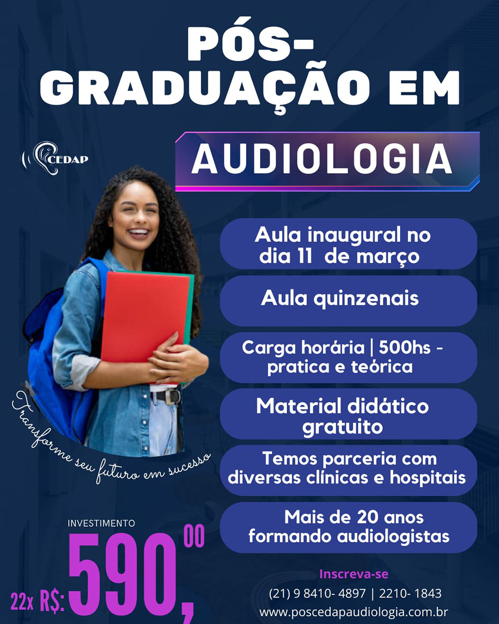 O curso de pós-graduação em audiologia Latu Sensu da Clínica-Escola CEDAP, se propõe a formar profissionais que entendam a audição como um sentido efetivamente participante de todo o processo de aquisição e desenvolvimento de linguagem não só receptiva, como também compreensiva e expressiva. Esta visão confere à Audiologia o mesmo status qualitativo, holístico e essencialmente sinérgico das demais áreas da Fonoaudiologia. Nosso proporcionará ao aluno um cenário de atuação 100% prático/supervisionado em todas as áreas da Audiologia, através dos diversos convênios existentes entre a Clínica-escola CEDAP e centros médicos, hospitais e empresas, tornando-se referência. Este resultado só é possível devido ao modelo do curso, à experiência do corpo docente e a excelência do ensino oferecido ao aluno. Ao final de cada módulo o aluno é submetido a uma avaliação de desenvolvimento acadêmico no intuito de incentivar a busca constante pelo conhecimento, atualização e ratificação dos conteúdos oferecidos durante o curso, tornando-o um aluno mais completo e com um diferencial competitivo no mercado de trabalho.
