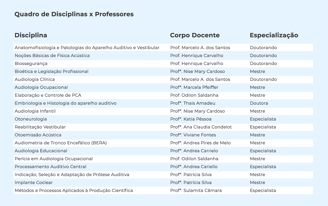 Somos reconhecidos pelo Conselho Federal de Fonoaudiologia, com mais de 15 anos de experiência nosso curso é constituído por profissionais altamente qualificados e atuantes no mercado de trabalho, faça um upgrade na sua carreira e adquira junto toda essa experiência.